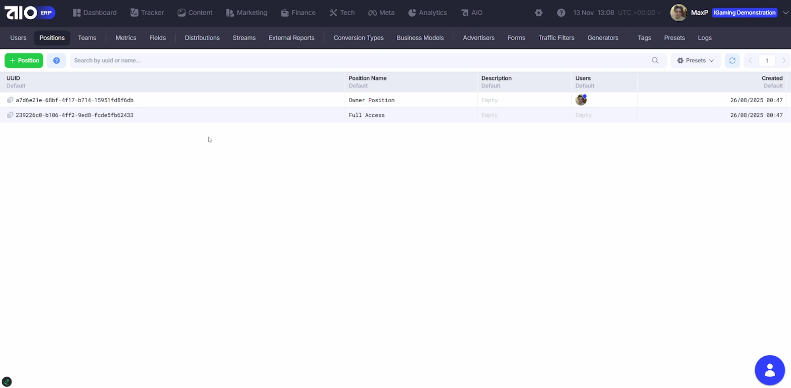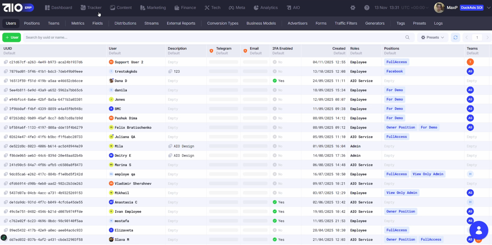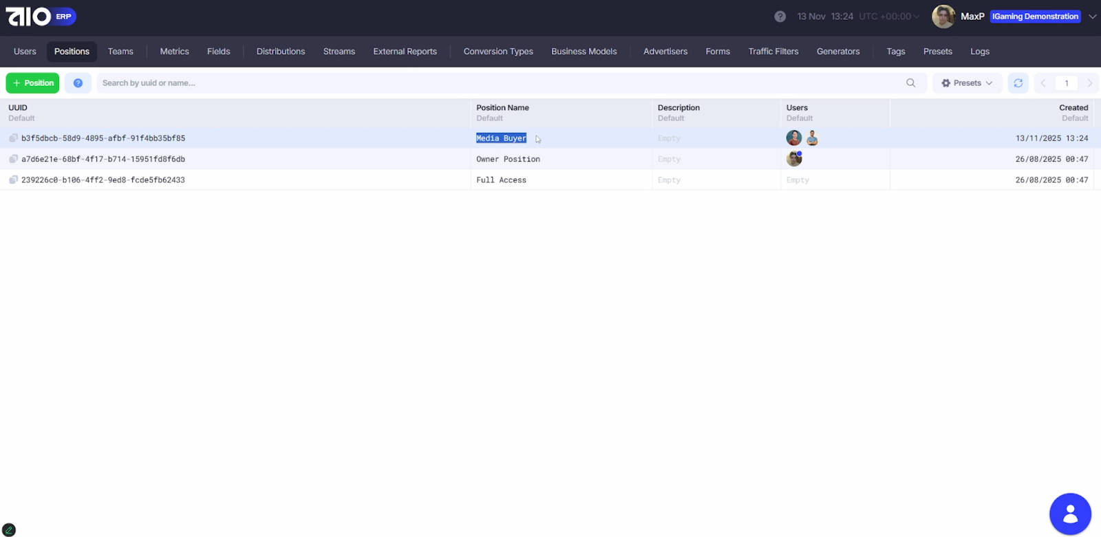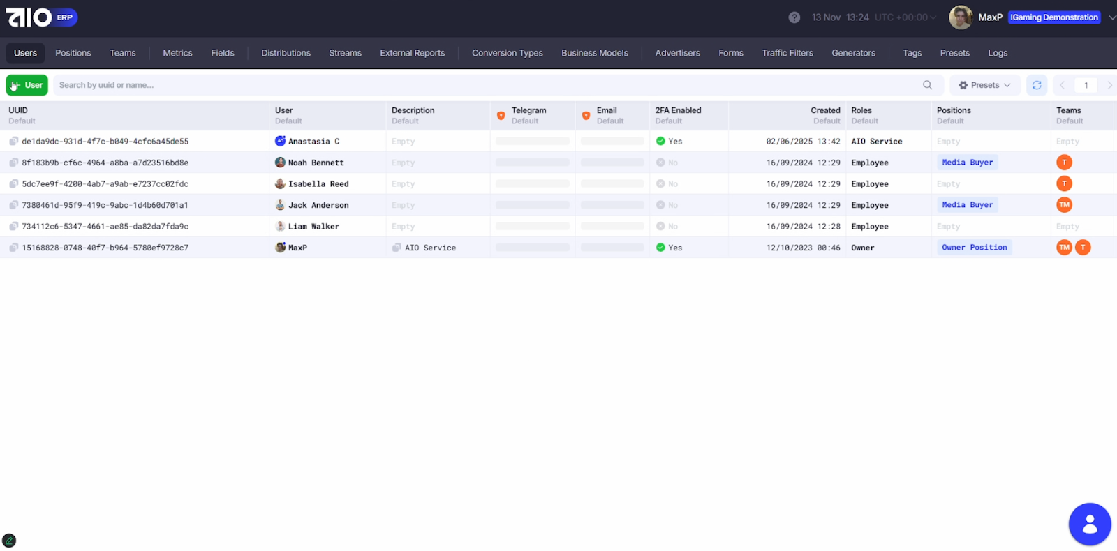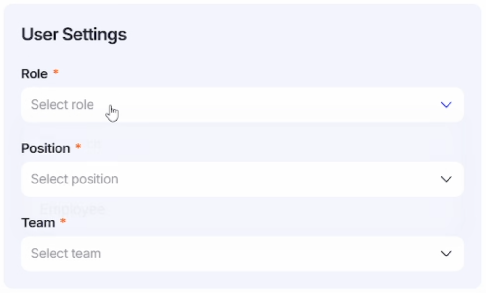 3. Users Settings – роль пользователя, его позиция и команда.