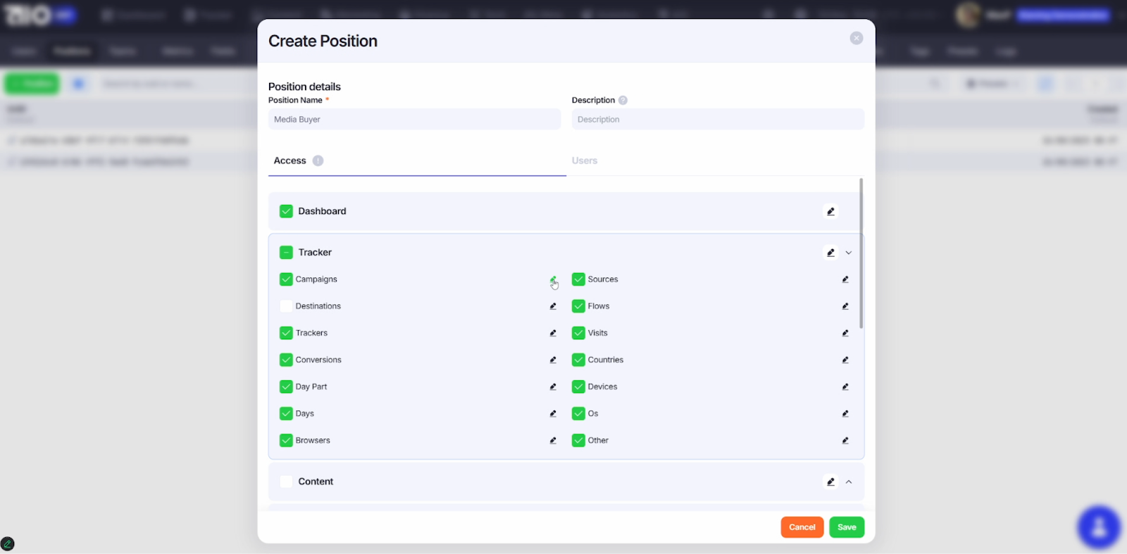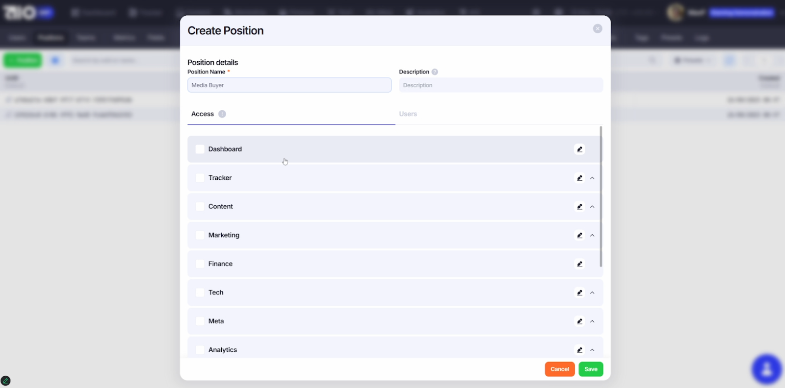 Указываем название позиции (Position Name) – обязательное поле, далее по желанию добавляем описание. В графе Access выбираем вкладки, которые будут отображаться пользователям с данной позицией.