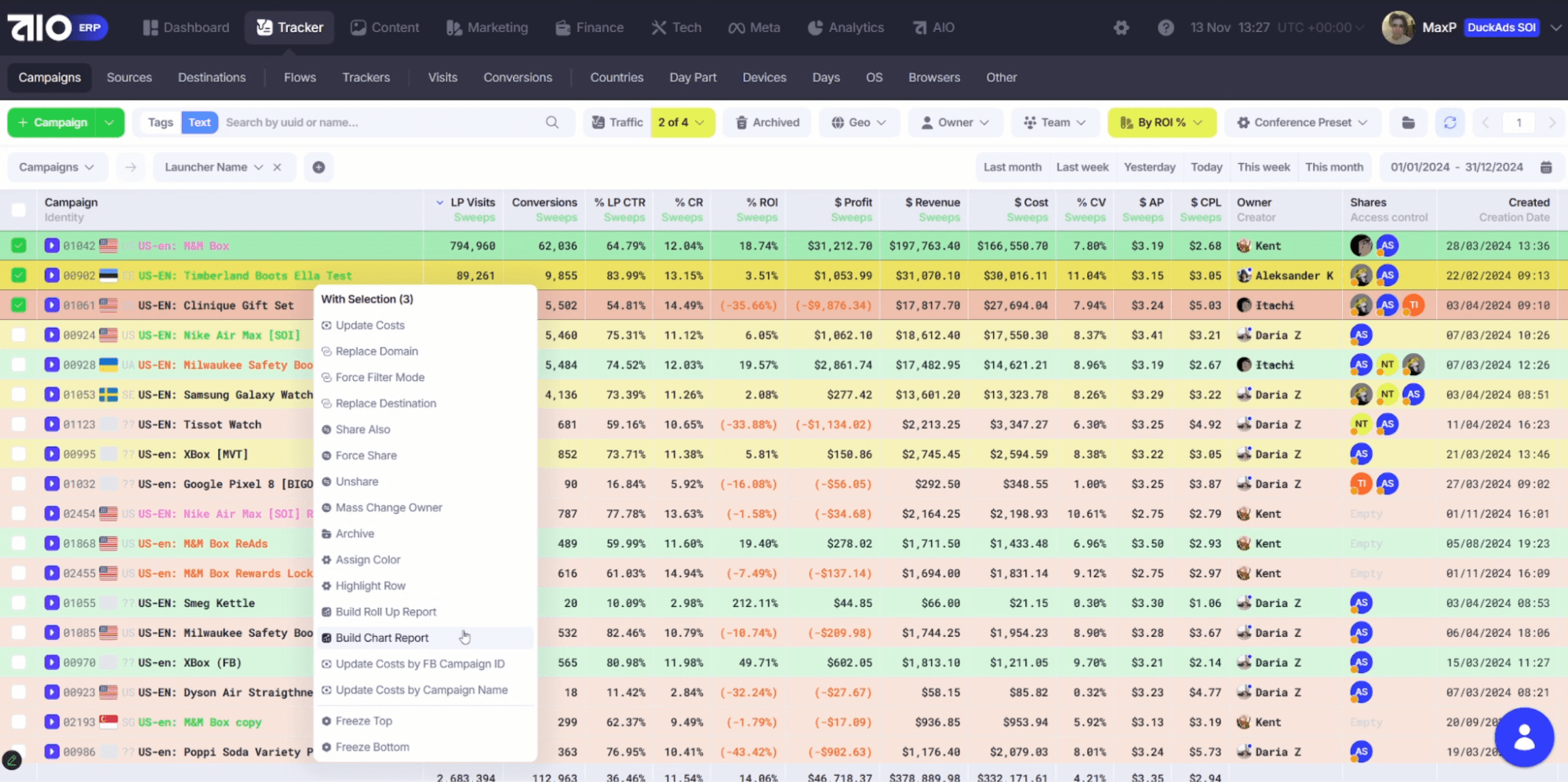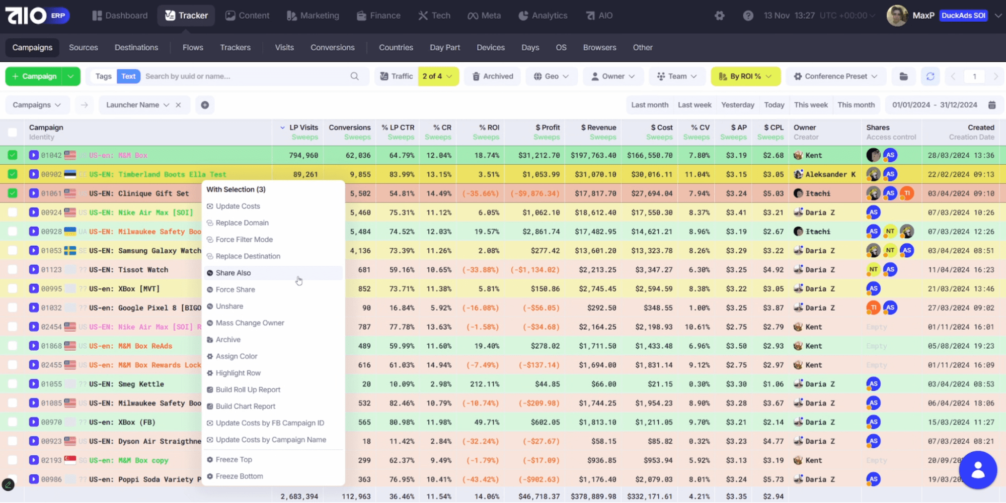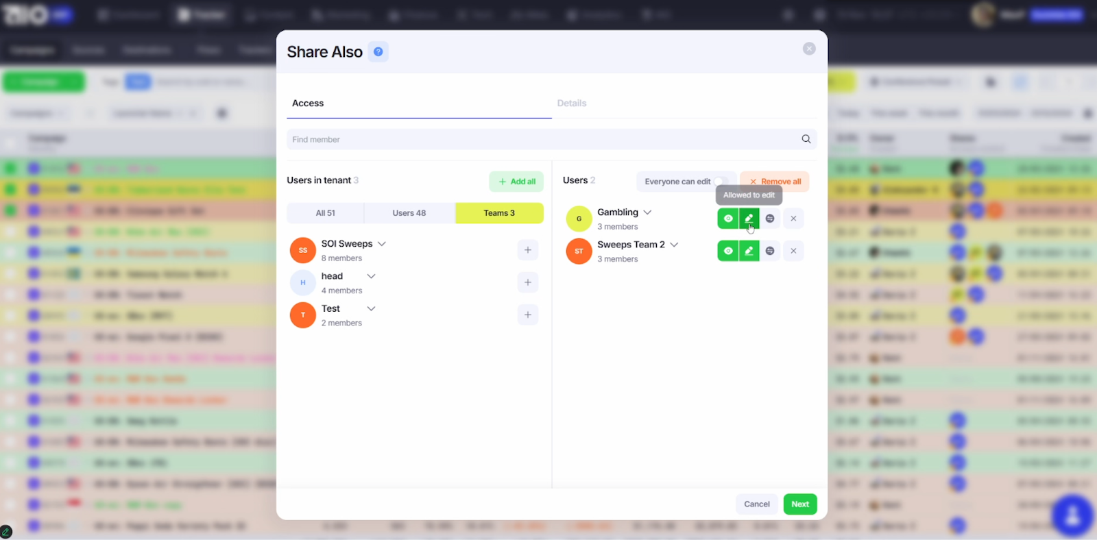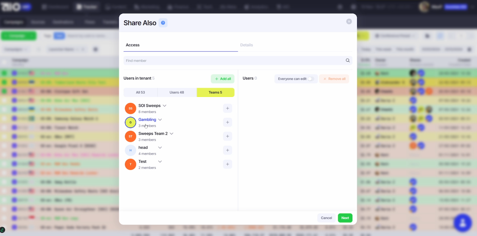 Команда создается из уже добавленных пользователей. В левом столбце отображаются все юзеры системы - перетягиваем нужных в команду. Можно назначить уровень: Team Member, Team Leader, Team Head. После сохранения команда будет создана. Теперь можно делиться любым элементом системы. Рассмотрим на примере кампаний. Переходим в трекер,
