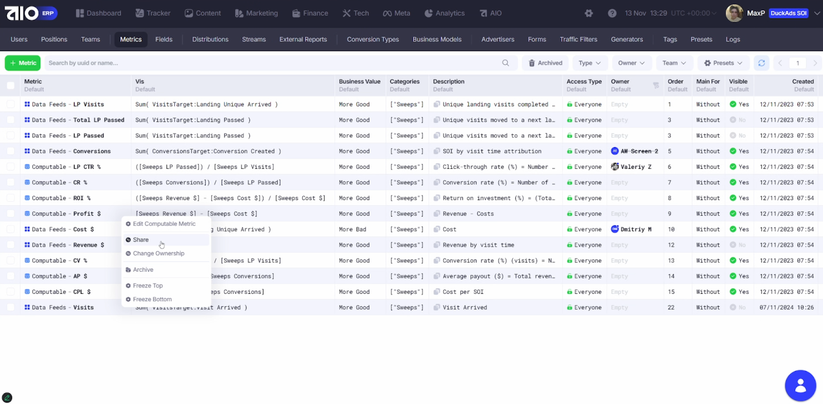 Делиться можно не только кампаниями, но и метриками.