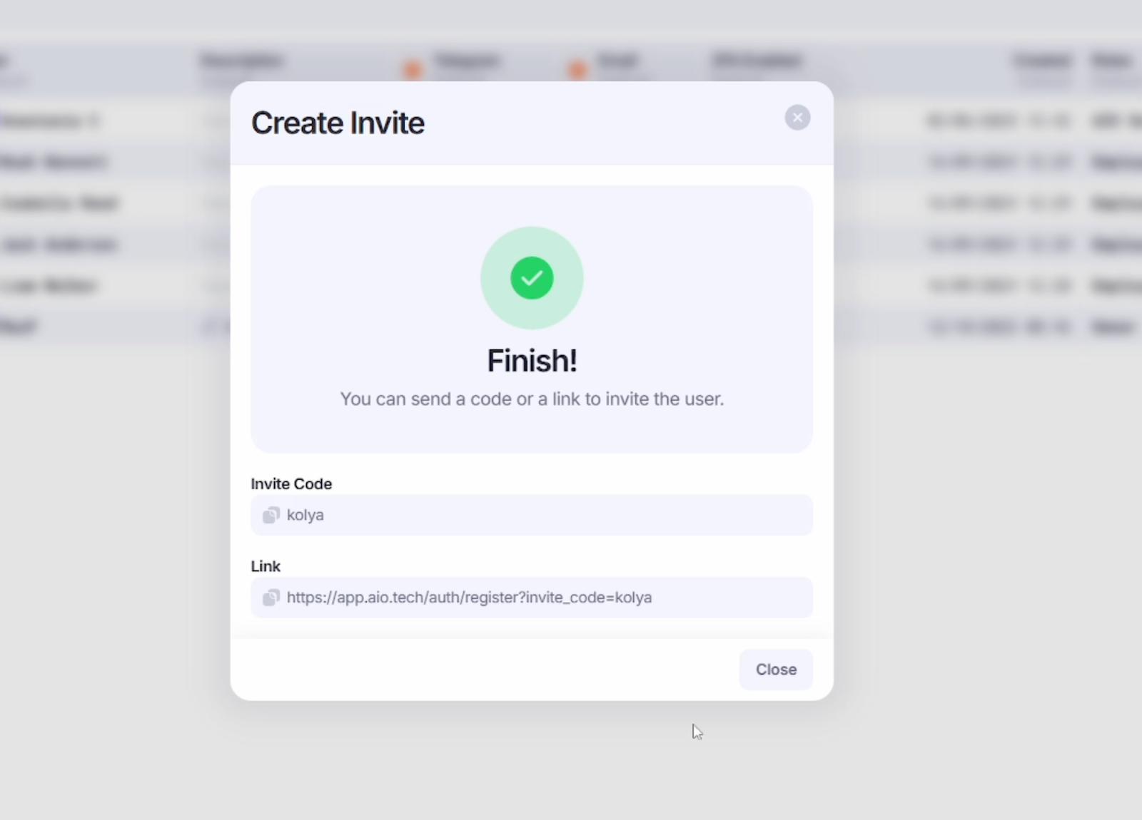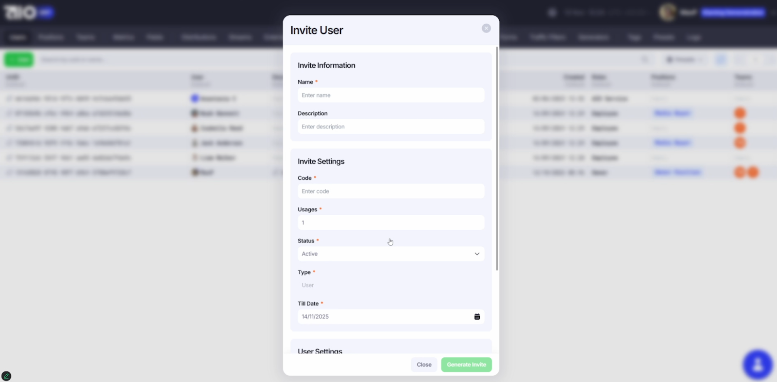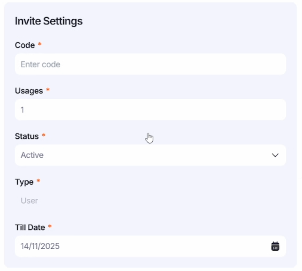 2. Invite Settings – уникальный код, количество использований, статус и срок действия ссылки-приглашения;
