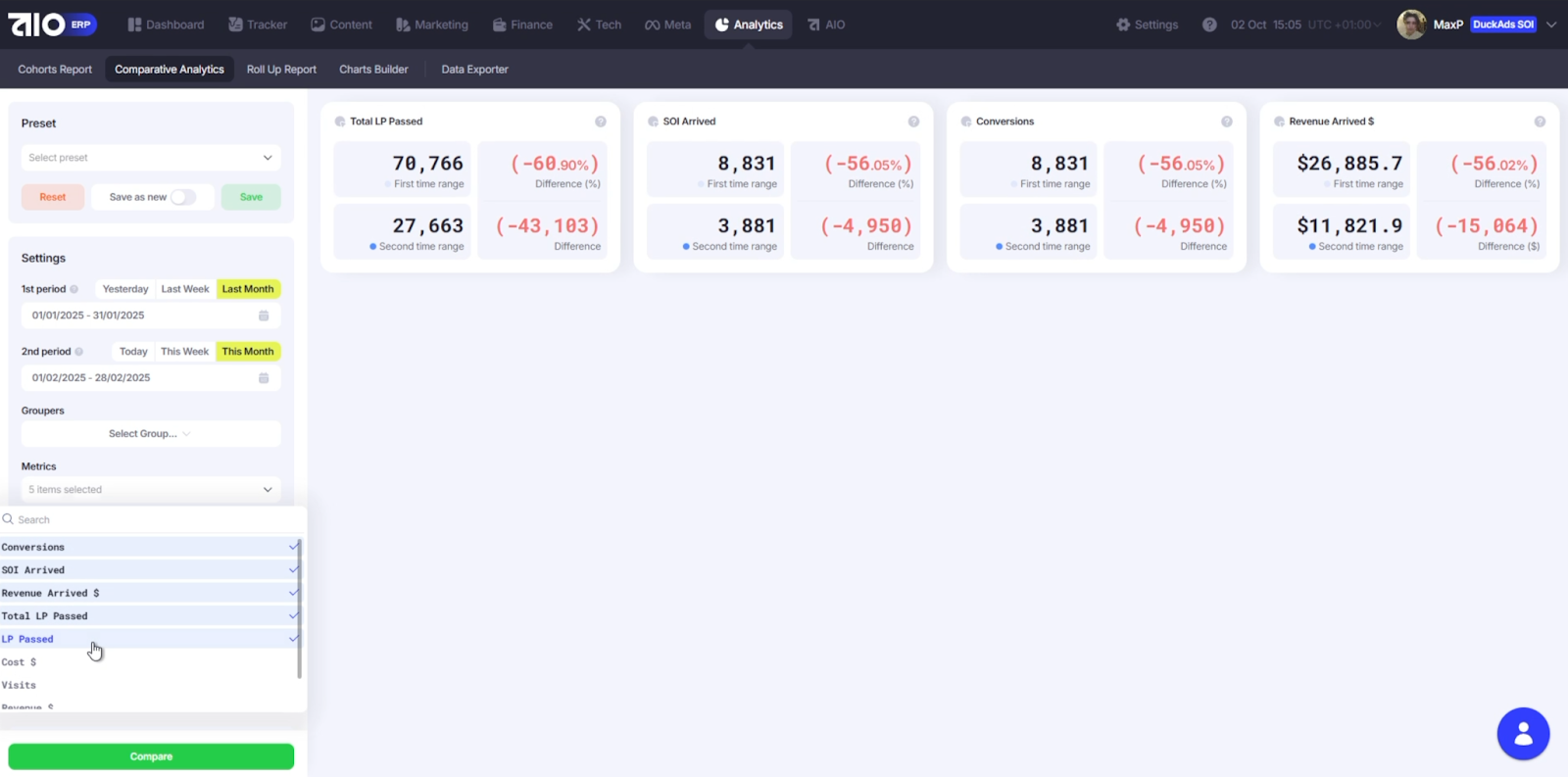 Если перейти в подвкладку Comparative Analytics вы можете собрать свой личный мини-дашборд, выбирая необходимые метрики, выставляя периоды и выбирая группы для отображения в дашбоарде (например, креатив, байер, команды, лендинги и так далее).