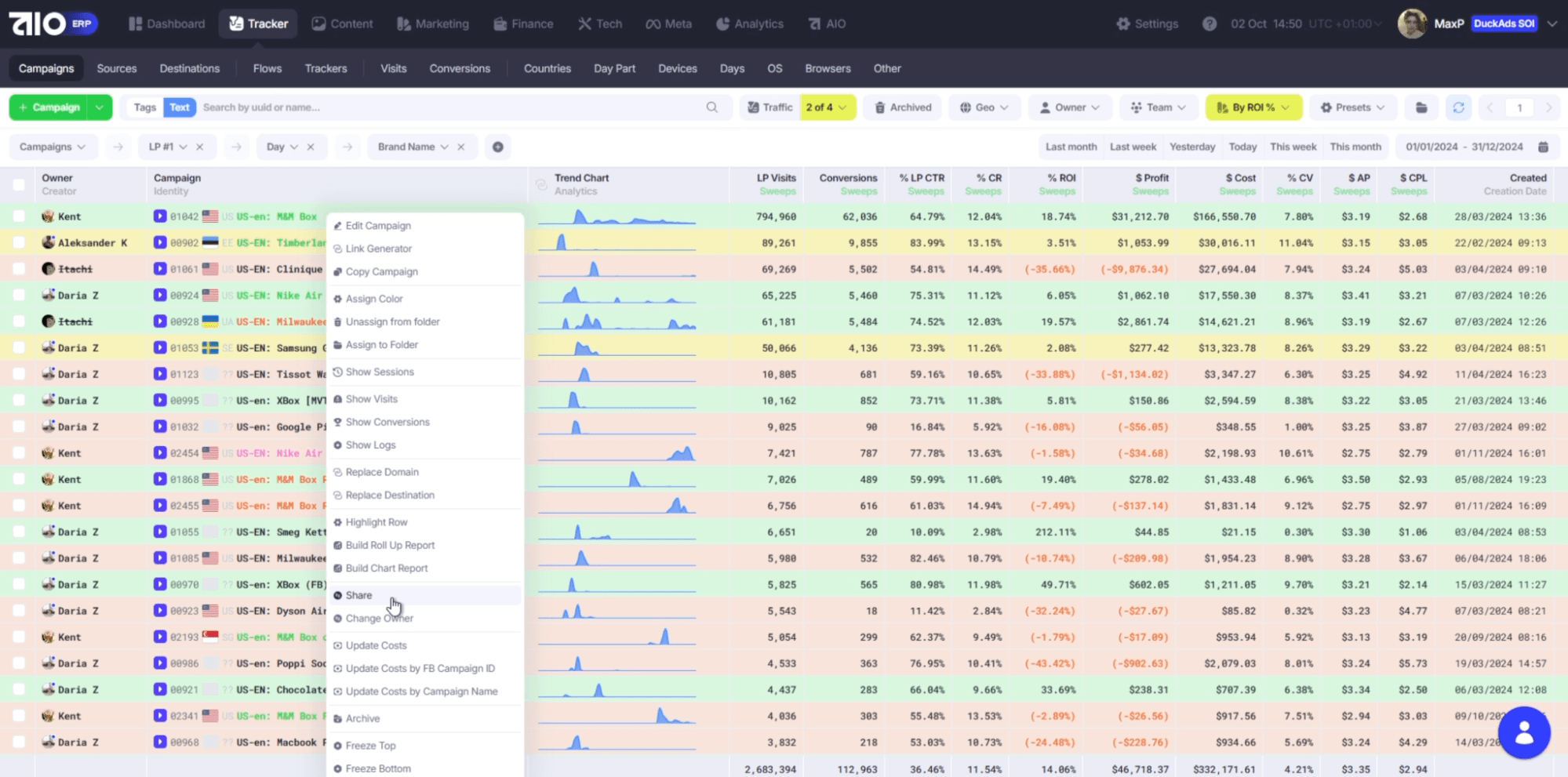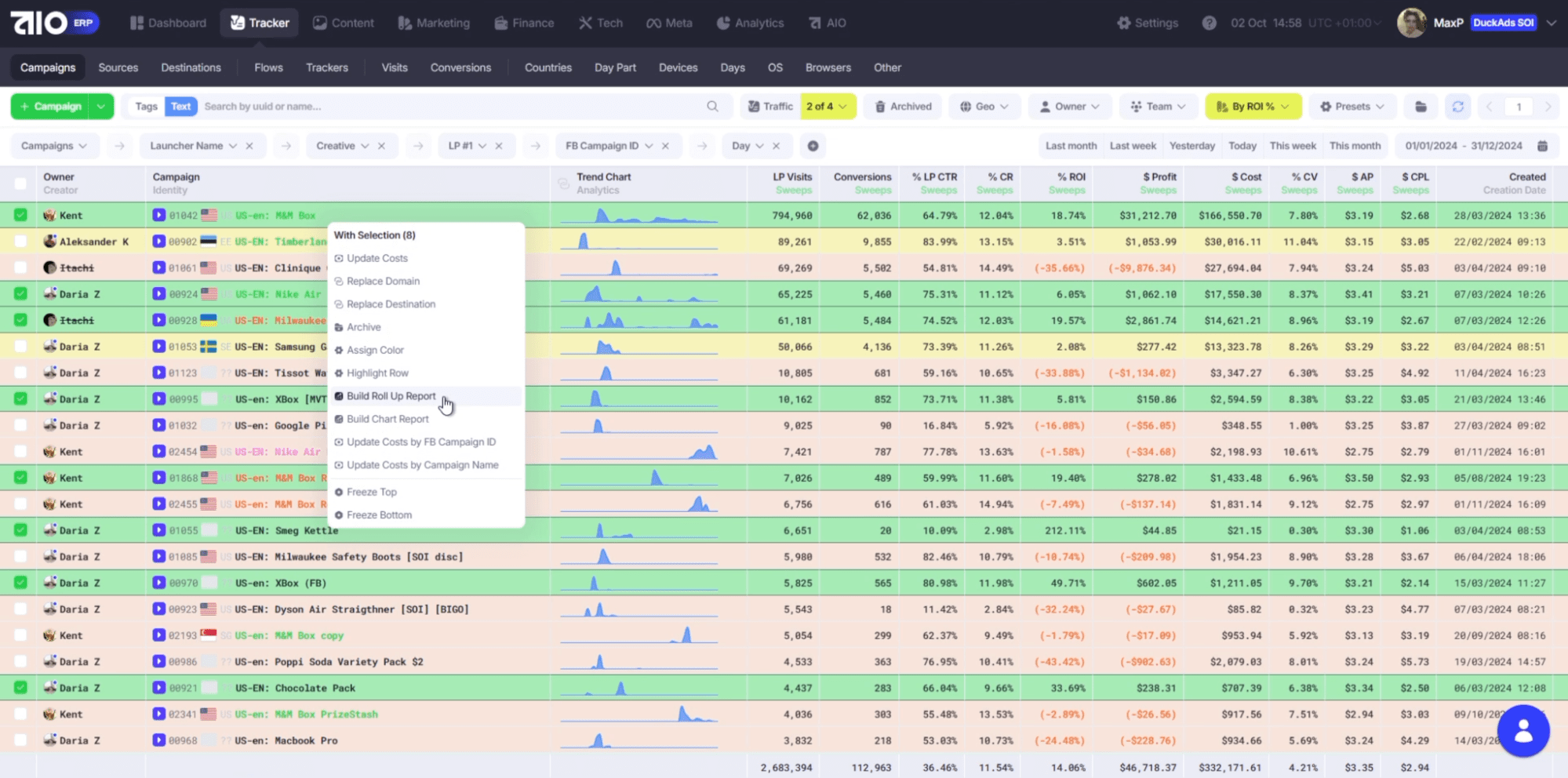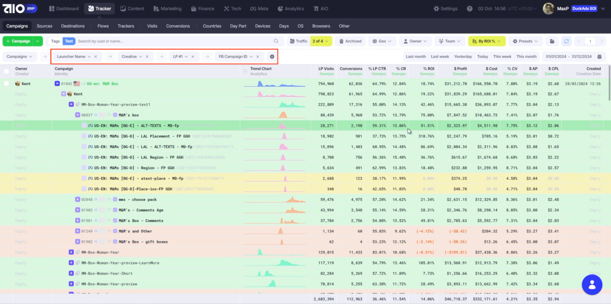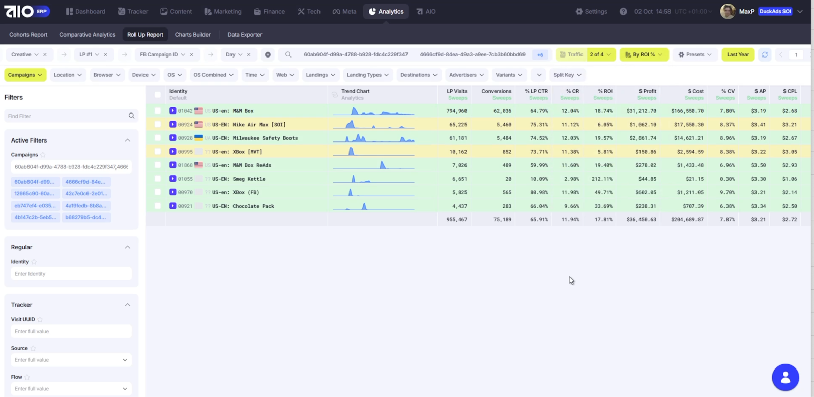Вот так выглядит фильтр по байеру, креативу, лендингу и кампании. Вы сразу видите по цвету плюсовые и минусовые строки, а также графики, статистику с автоматически рассчитанным ROI, расходами и профитом.