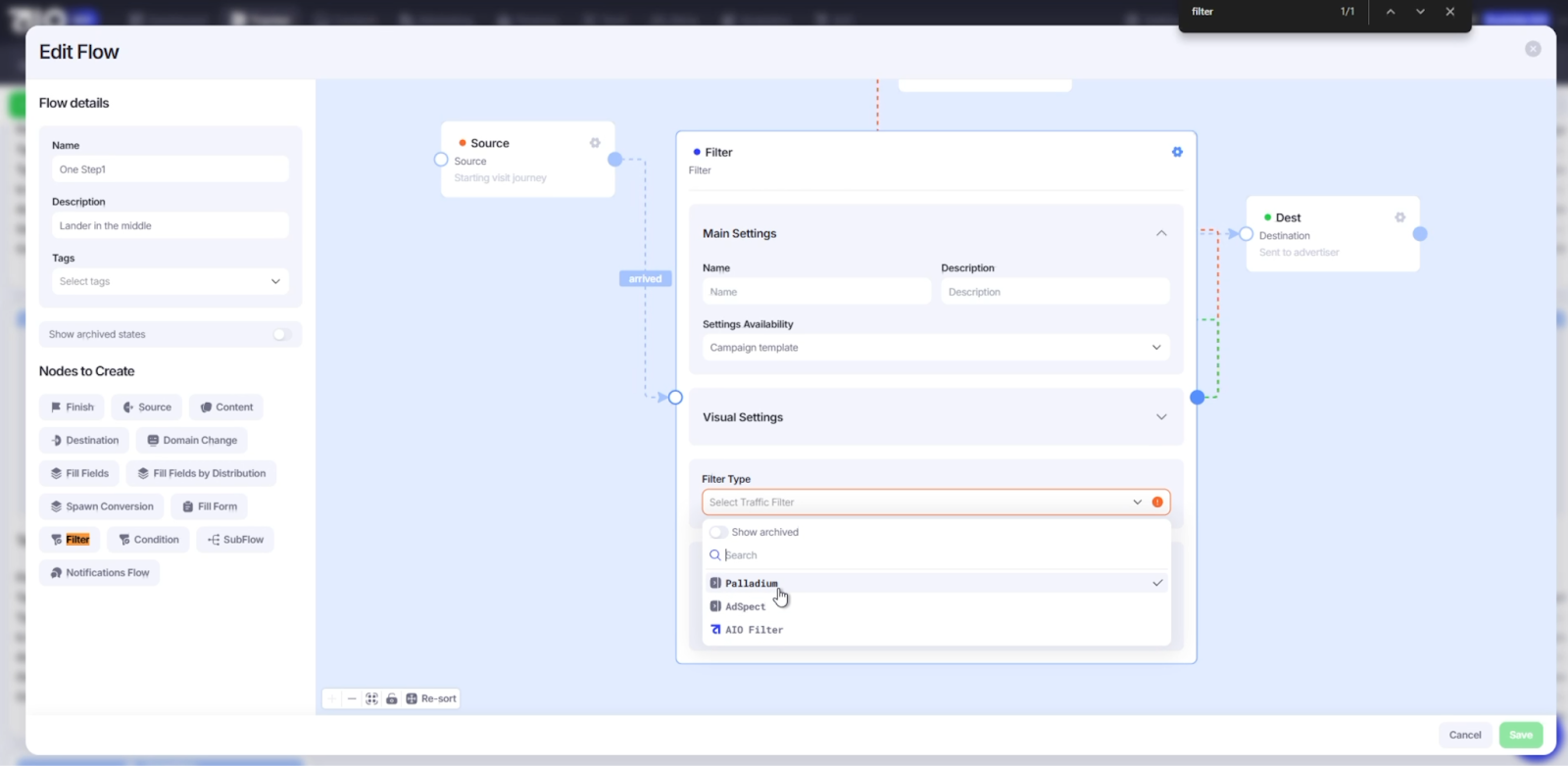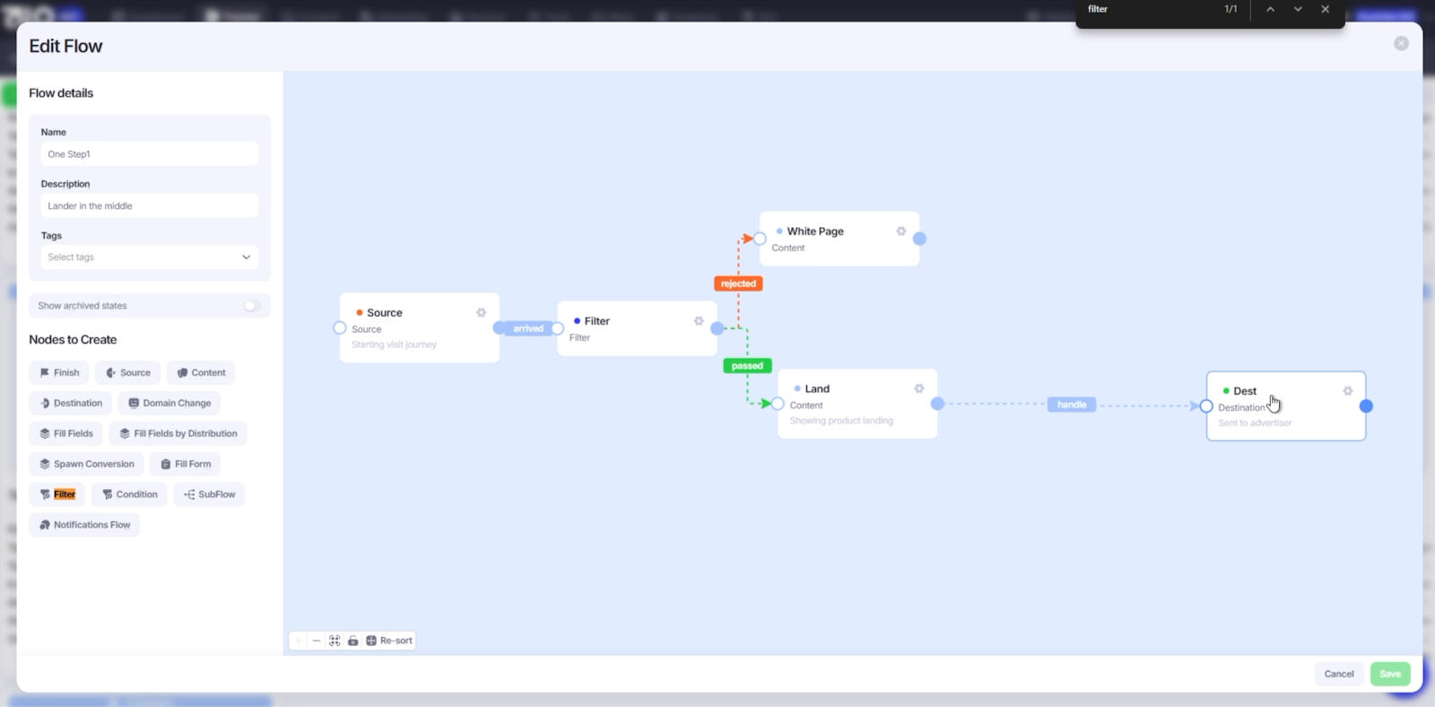 Сама клока добавляется в потоке с помощью блока Filter. Вы просто добавляете блок и соединяете его стрелками. Если нужно уводить нерелевантный трафик на WhitePage – выбираем rejected, если трафик целевой – passed.