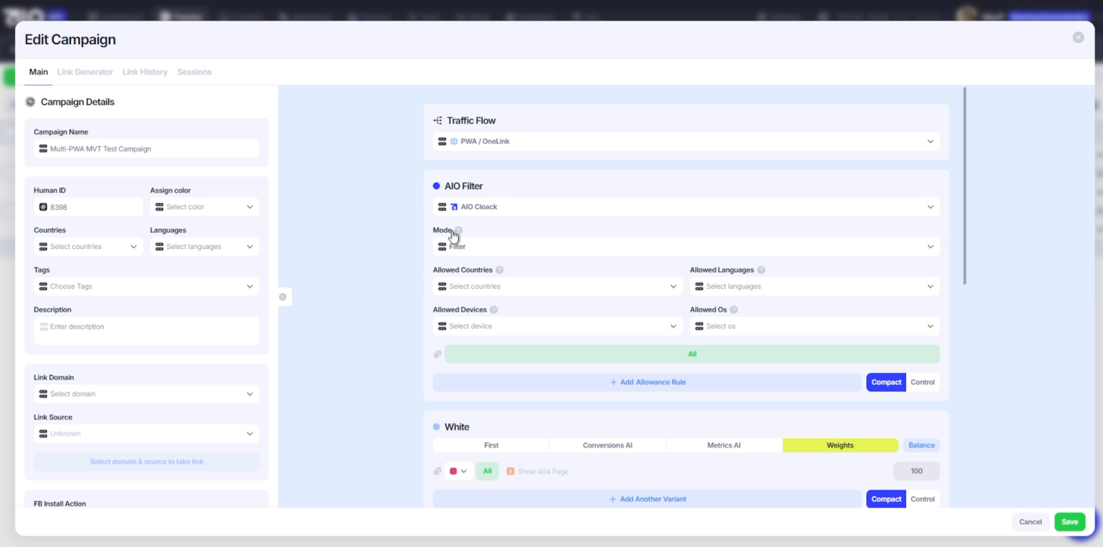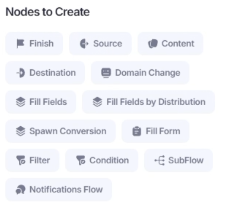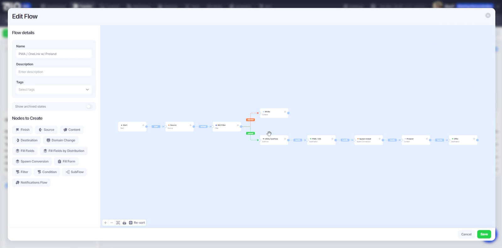 В АИО это реализовано таким образом, что вы просто добавляете нужные точки взаимодействия с аудиторией (прелендинги, лендинги, витрины, формы регистраций, пва сервисы, собственные пва, интеграции с вебвью приложениями, фильтры, ремаркетинг флоу, правила и прочее) и протягиваете ниточки в соответствии с тем, как должен идти пользователь по воронке.