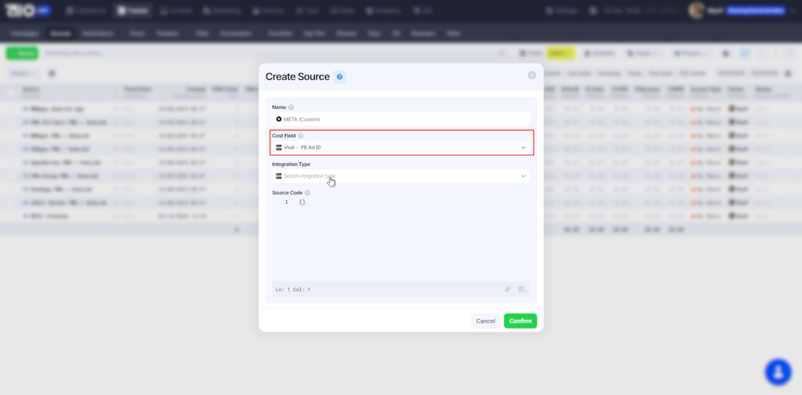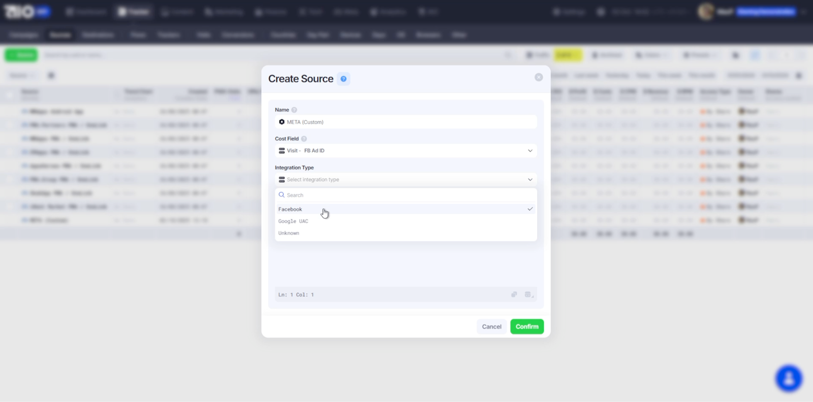 Выбираем Integration Type (тип интеграции), у нас это Facebook, и нажимаем Confirm.
