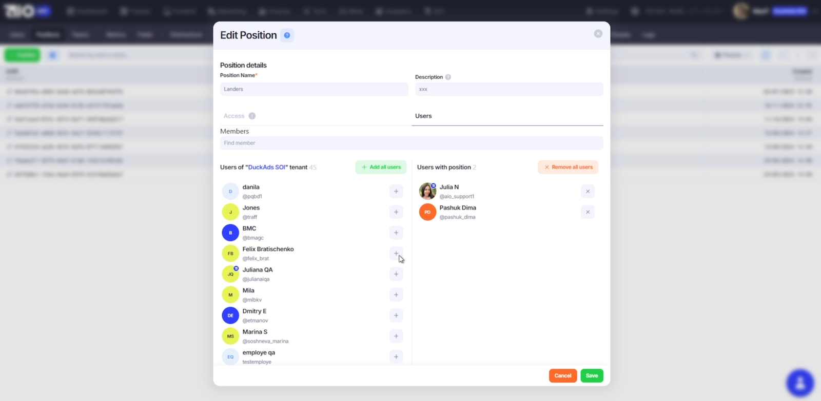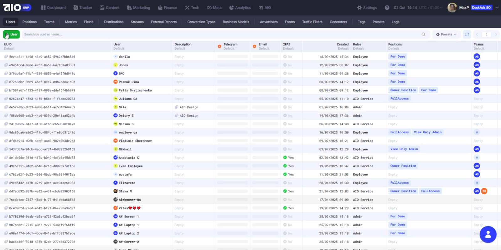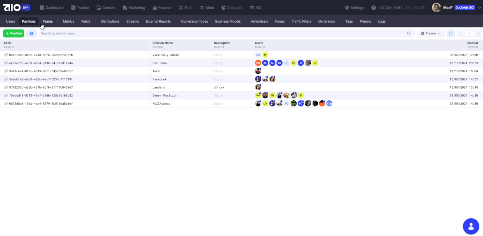 Для этого переходим в Positions. Под позицией в AIO подразумевается должность и настройки доступов для пользователя.