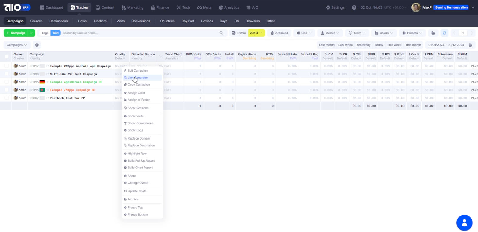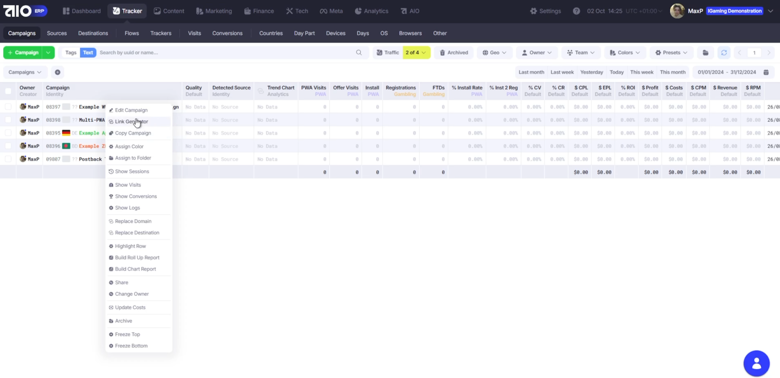 достаточно нажать правой кнопкой мыши на нужную кампанию и выбрать Link Generator.