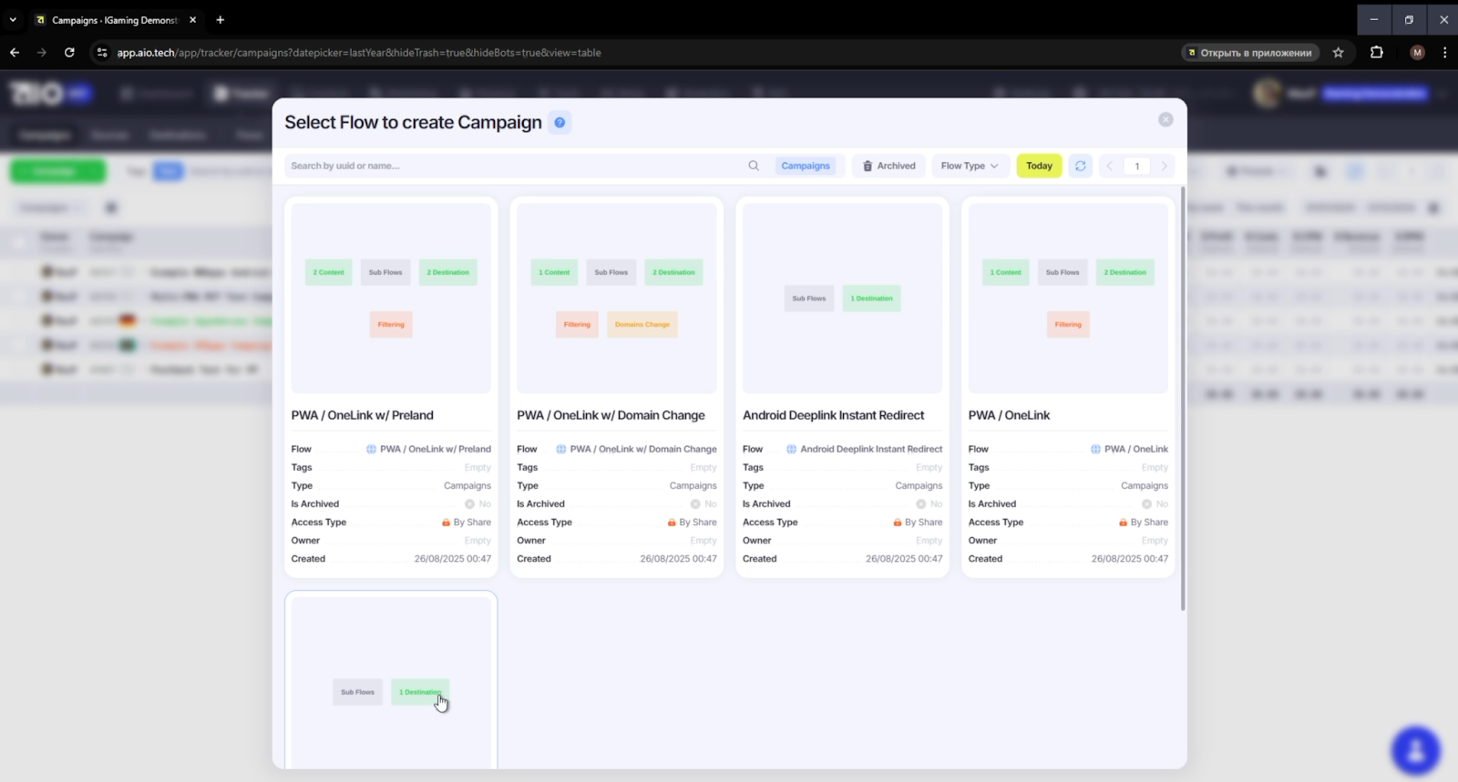 Рассмотрим секцию Destination. Она позволяет вам настроить интеграцию с вашей партнерской программой, рекламодателем, CRM или с любой промежуточной точкой конверсии (PWA-сервисы, Webview-приложения). По сути, это расширенный аналог Offers в других трекинговых системах.