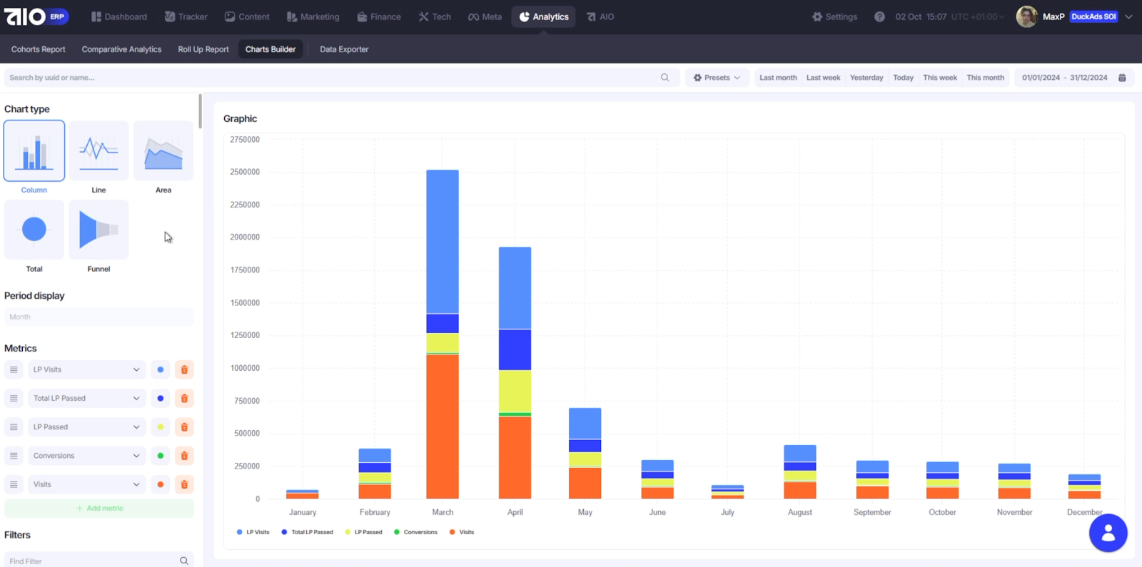 позволяет смотреть статистику в виде графиков и доступна во вкладке Charts Builder. Как и во всём AIO, вы можете настроить метрики и фильтры под себя и выбрать один из пяти типов графиков