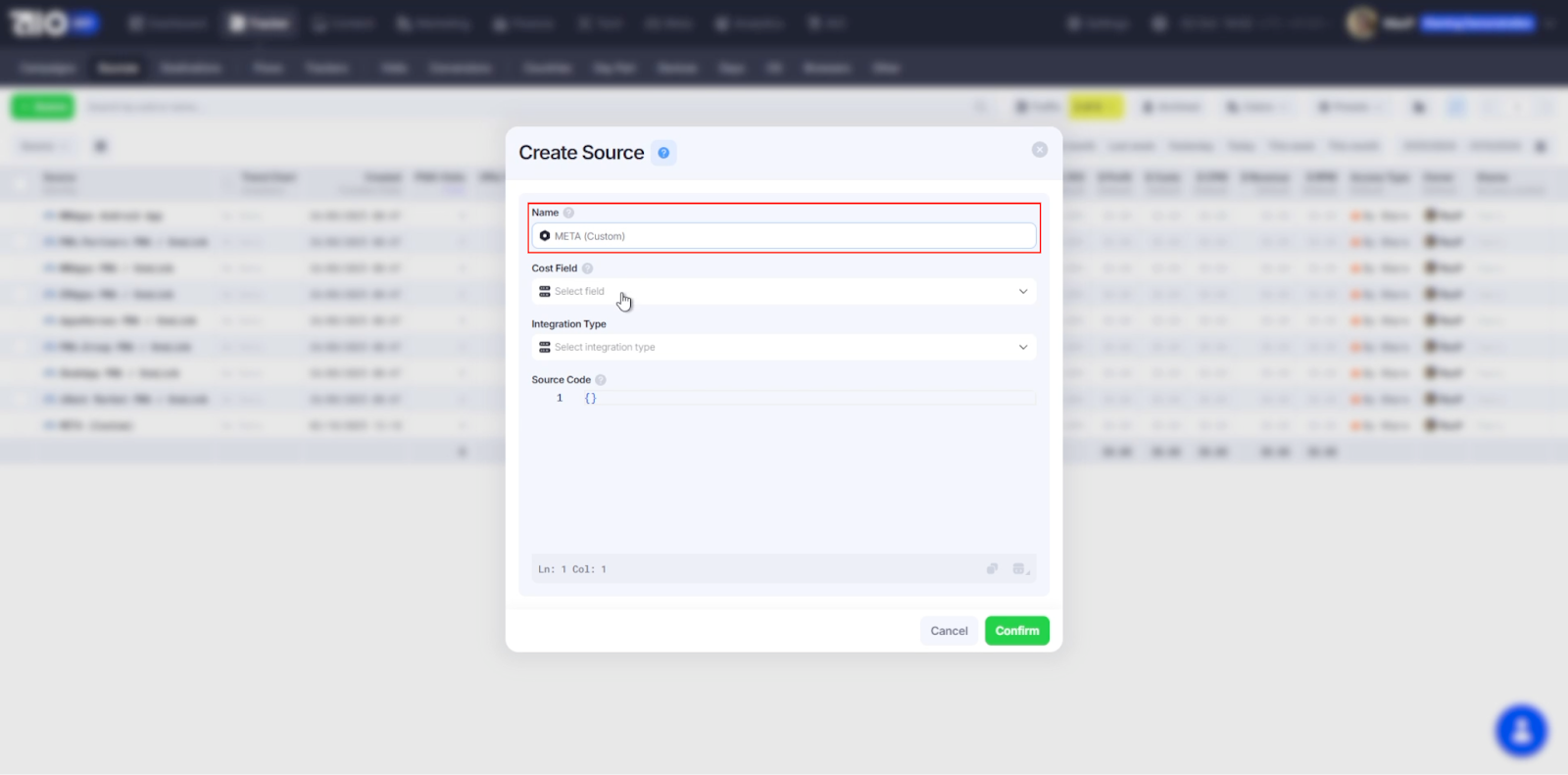 В поле Name устанавливаем название источника в зависимости от ваших целей (Например: Facebook* Custom, Facebook* Predefined и так далее).