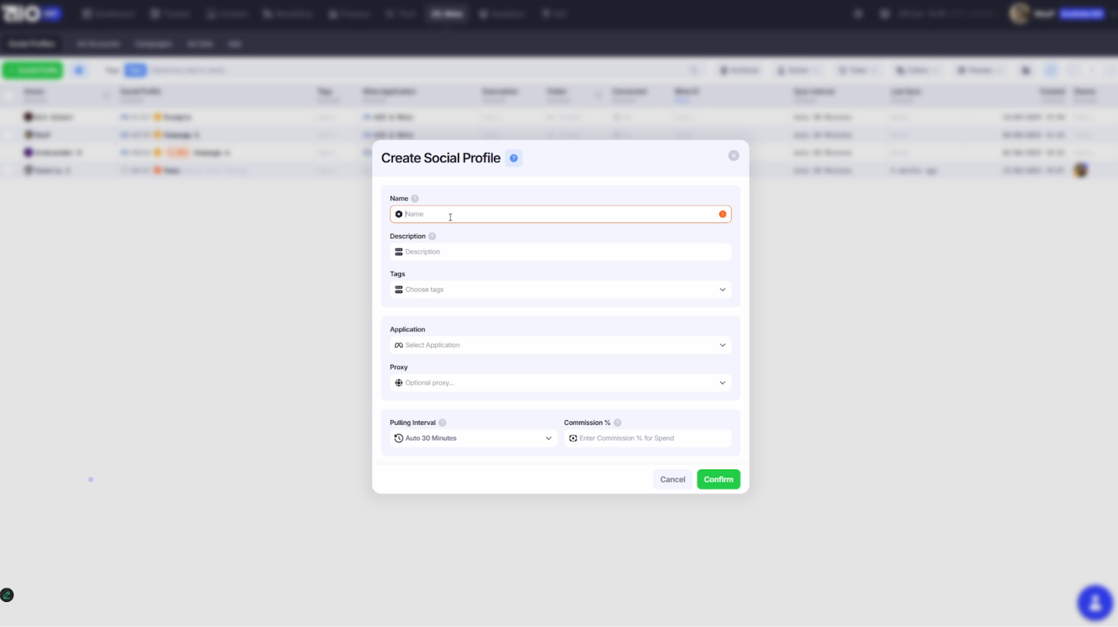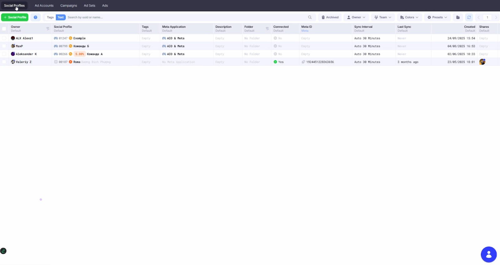 Во вкладке Meta* выбираем Social Profiles и через “плюс” в левом верхнем углу добавляем соц (аккаунт профиля в FB*).