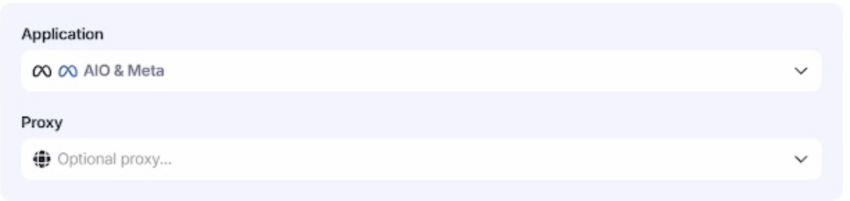 В выпадающем списке Application выбираем AIO & Meta* и по необходимости добавляем прокси.