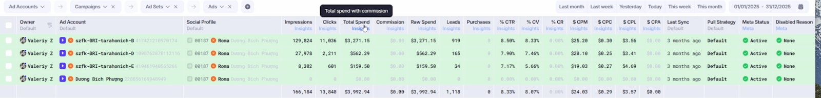 Во вкладке Ad Accounts вы получаете хаб со всеми вашими рекламными аккаунтами и статистикой за прошедший месяц, которая обновляется каждые 30 минут. Также есть возможность группировать по тем же фильтрам, которые мы проходили в Мануале №3.