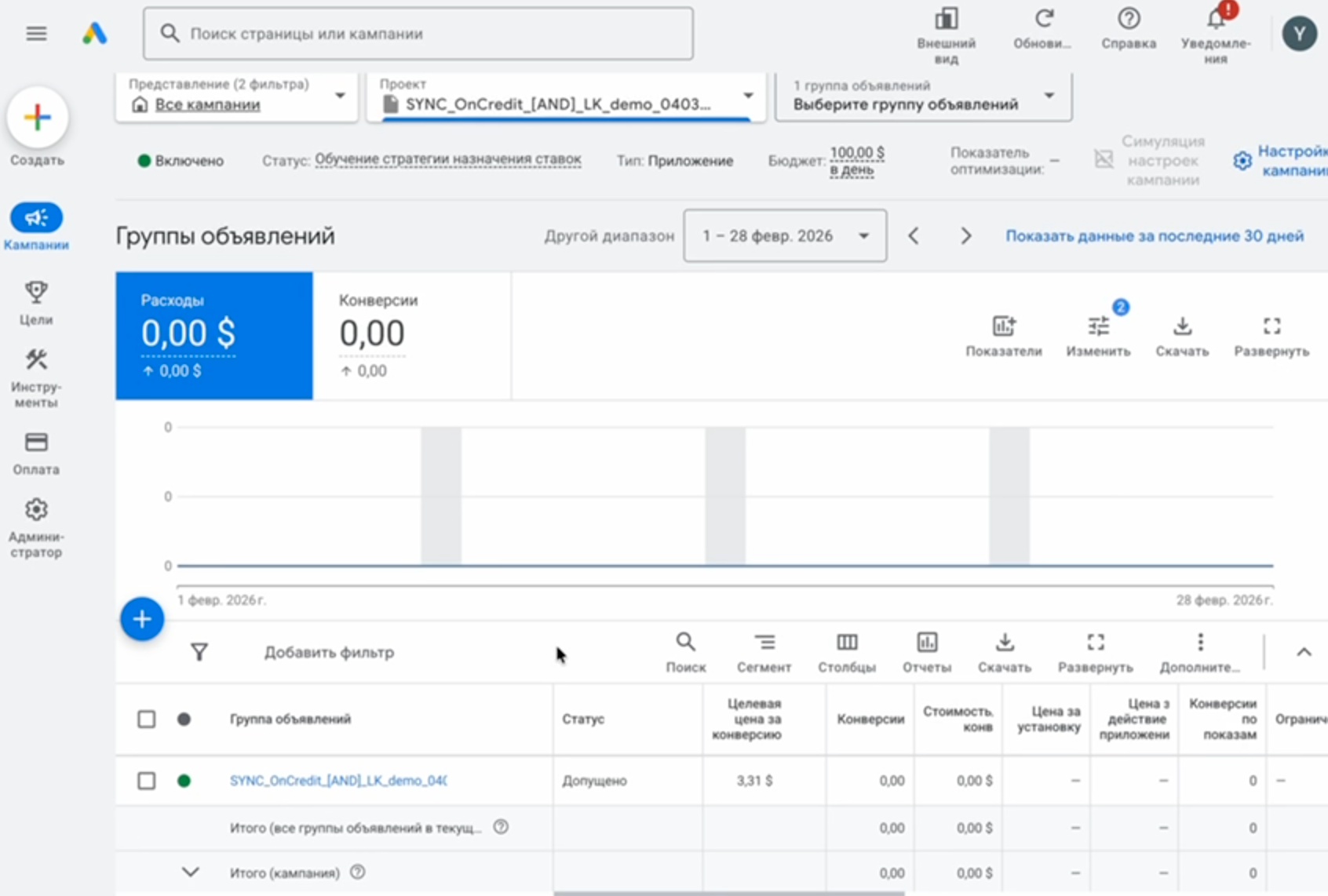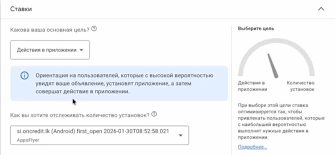Раздел со ставками. В основную цель поставим Действие в приложении, так как рекл платит непосредственно за выданный займ.