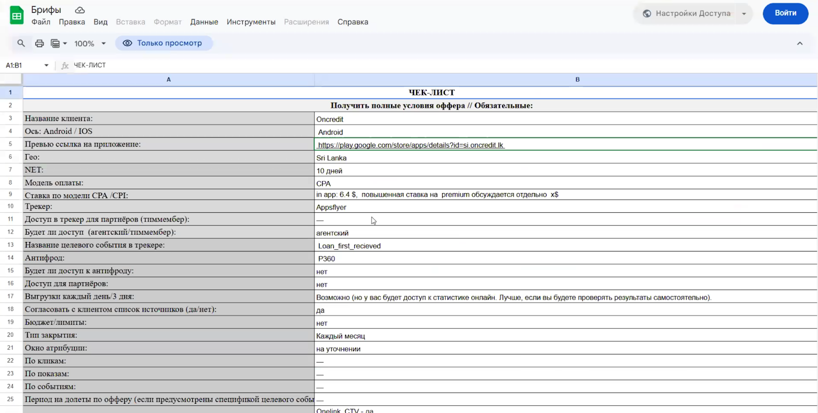 Каждый оффер в партнерке, в нашем случае оффер на приложение, имеет свой бриф/чек-лист.