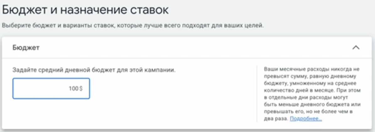 Раздел с бюджетом, где указываем средний дневной бюджет для кампании.