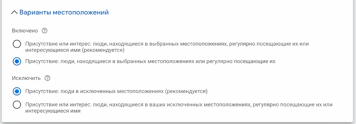 Еще одна особенность GoogleAds – Варианты местоположений. Здесь есть возможность включить и исключить пользователей как резидентов, так и не резидентов выбранной страны.