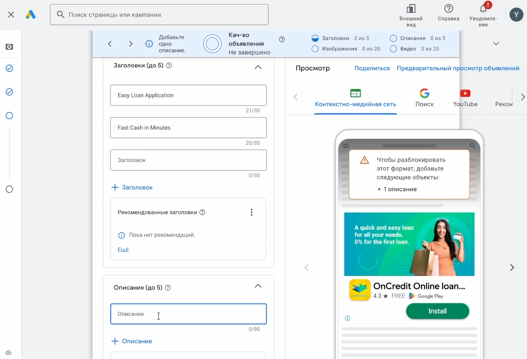 Заполняете заголовки, описание и грузите креативы. Можно подготовить несколько вариантов для дополнительных заголовков, описаний и креативов, не нужно заполнять все, достаточно двух-трех заголовков.