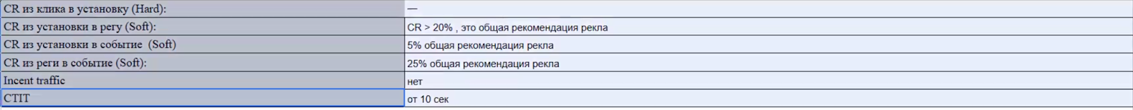 За каждый инсталл, который будет проходить в рекламной кампании, рекламодатель будет платить деньги. То есть неважно, что льёт не он, инсталл на его стороне, и он платит за это свою копейку. Для рекламодателя важно не получить миллион установок и одну конверсию, а чтобы это соответствовало KPI. Поэтому в чек-листе есть Soft/Hard KPI – это усредненная статистика от рекламодателя на соотношение конверсий.