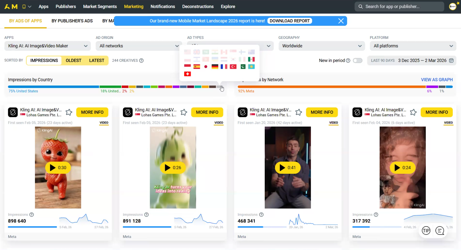 Если приложение поддерживает несколько стран, то здесь уже, конечно же, обязательно поставить ту географию, которая нужна по вашему офферу и смотреть релевантные креативы.