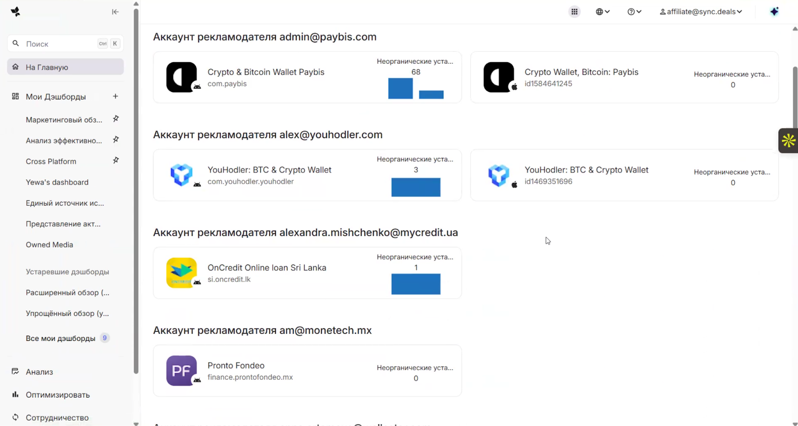 Именно им пользуются в Sync лично мы, Благодаря функционалу вы можете на уровне приложения понять соотношение нужных источников, какие креативы крутятся сейчас, какие крутятся эффективно, чтобы взять рабочую связку, модель и крео и залить в нужный источник.