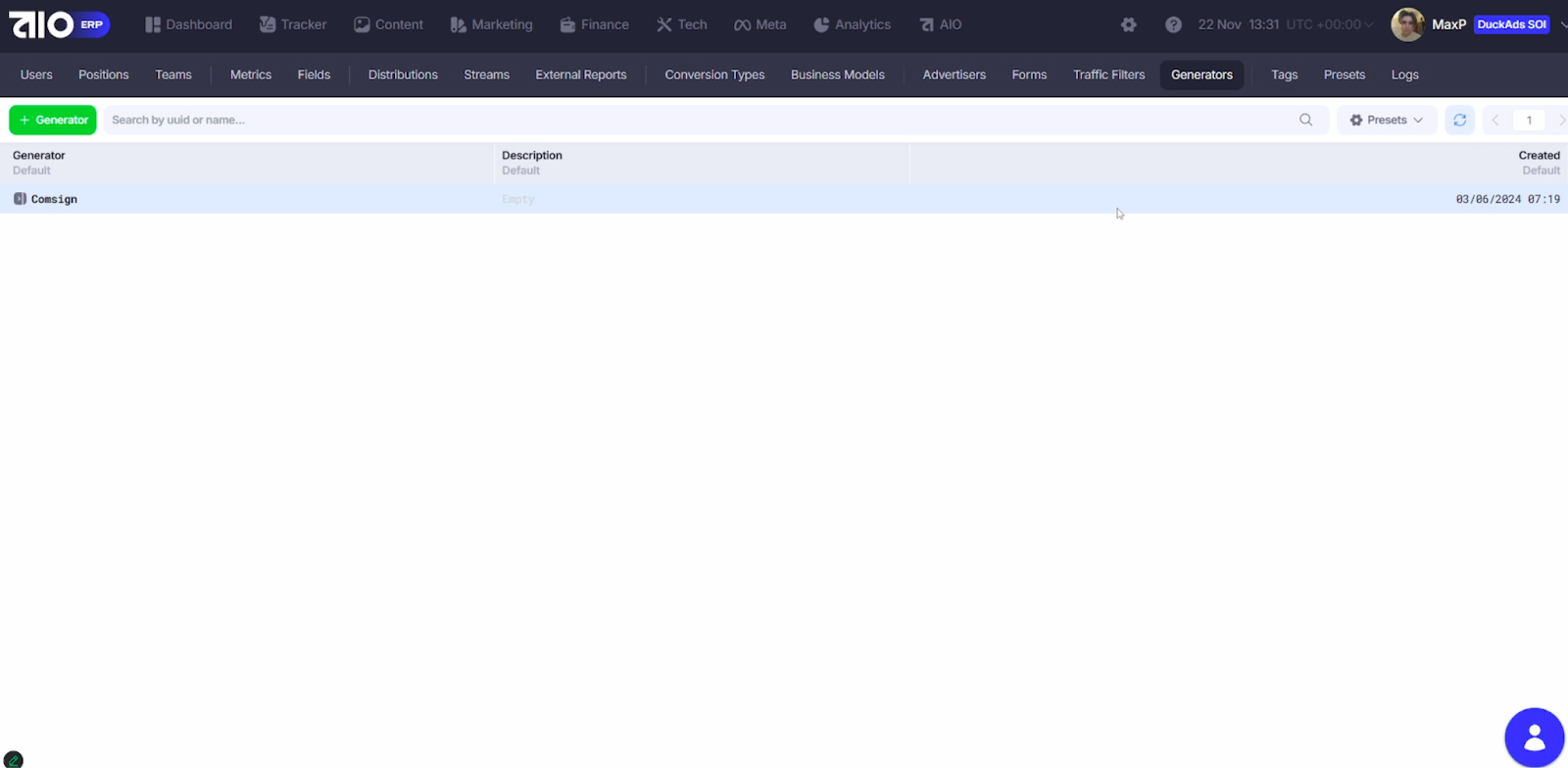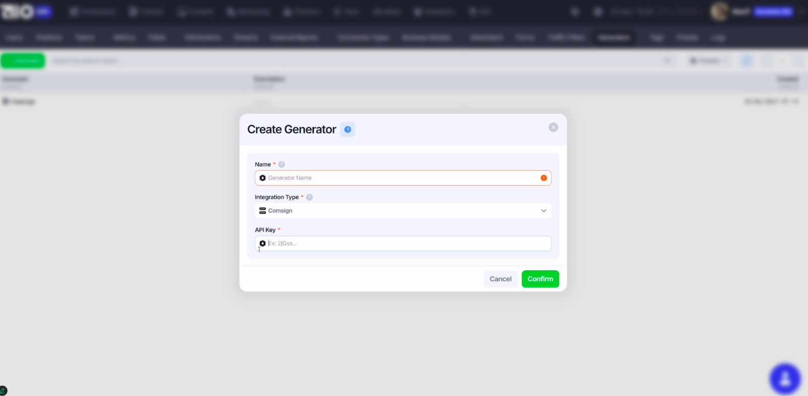 В AIO возможна интеграция с сервисами генерации White-page. Рассмотрим на примере Comsign. Для добавления нажмите «+», назовите генератор, выберите Comsign и вставьте API-ключ.