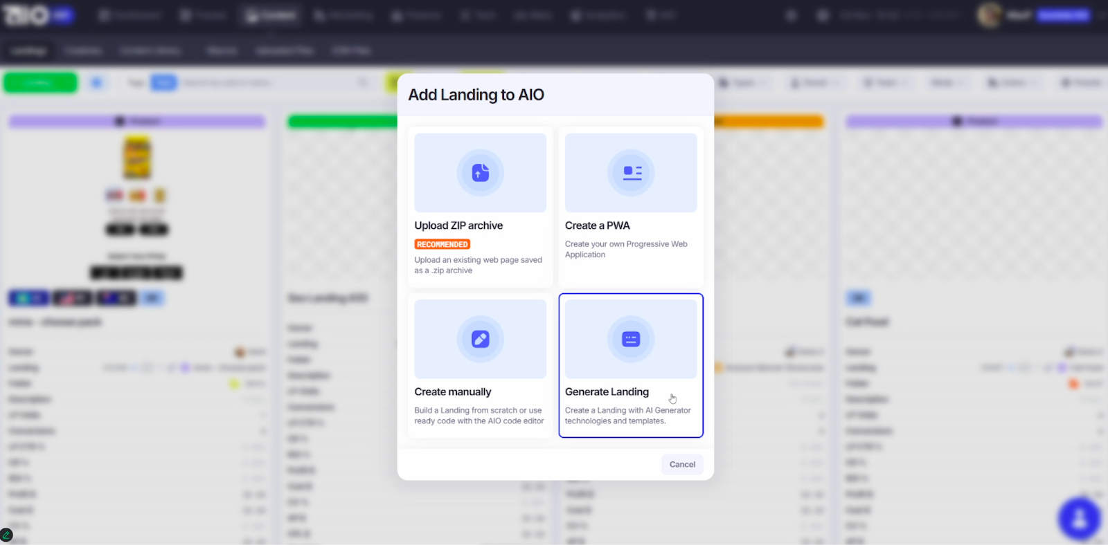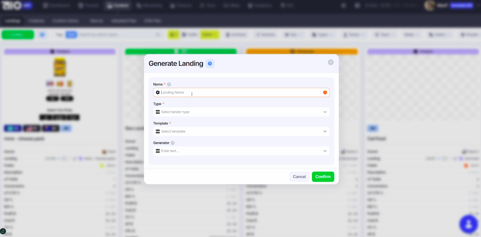 После этого переходите в лендинги, нажимаете «Добавить» и выбираете Generate Landings.