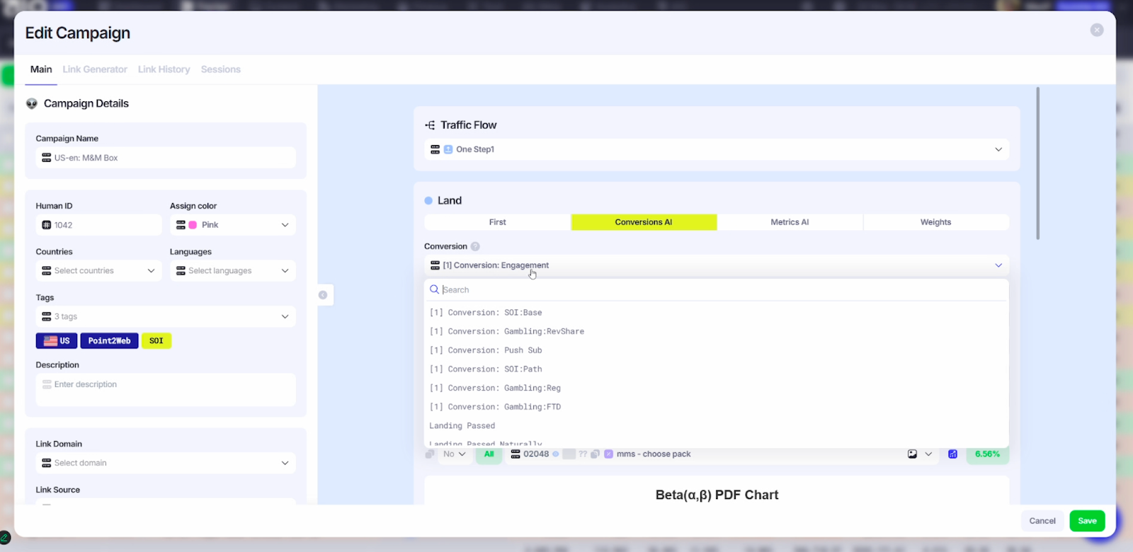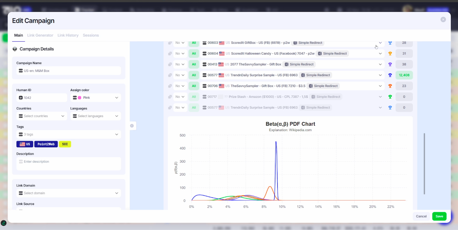В интерфейсе также доступно beta-распределение трафика - статистика по элементам (рекламодателям, лендингам, вариациям текста и т.д.). На основании выбранного типа конверсий строится график: по горизонтали - процент конверсий, по вертикали — объем трафика. Это позволяет отслеживать «борьбу» элементов между собой, отключать минусовые и направлять бюджет на плюсовые.